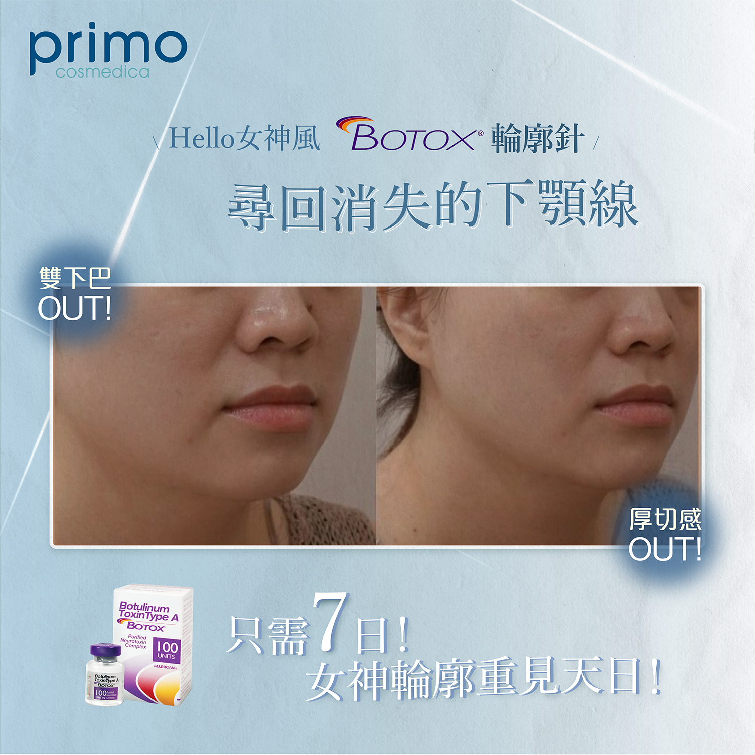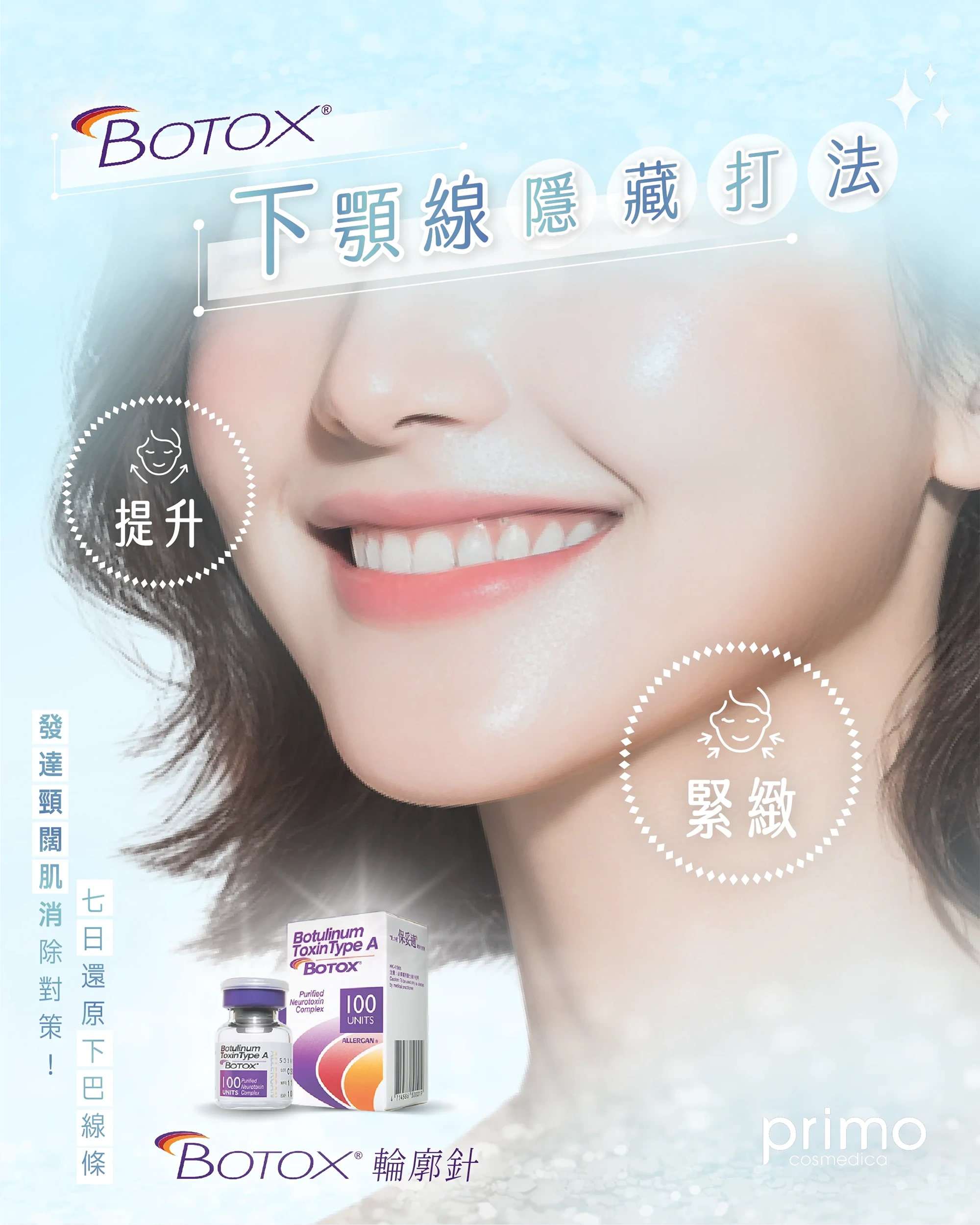 BOTOX® 輪廓針 可以放鬆下拉肌群,尤其改善臉頰下方的下顎線,以及上頸部線條之後,全臉拉提的效果就更明顯。